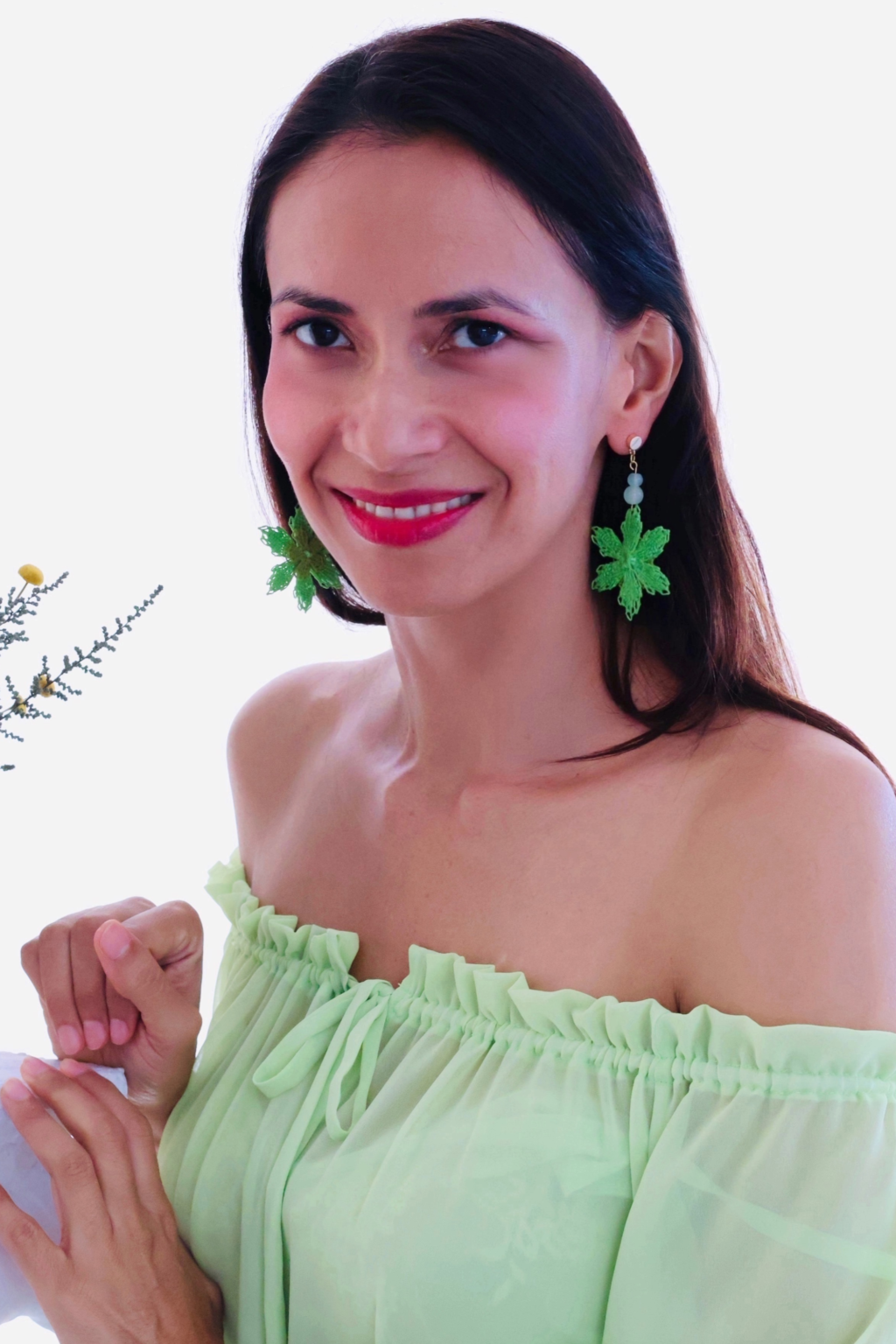 Jade Pendientes en técnica de Ñandutí, con detalle de flor de cristal.