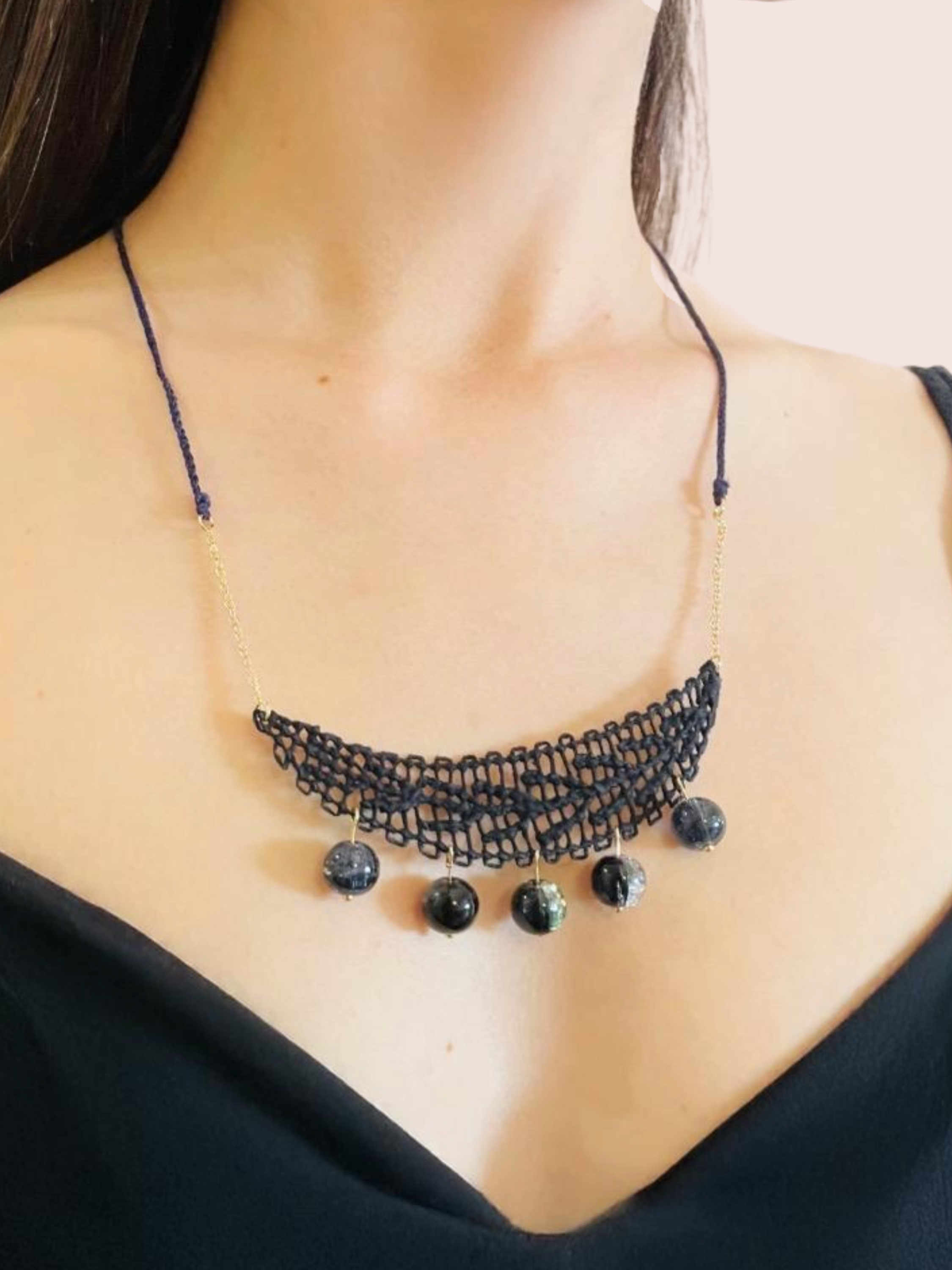 Materiales: hilo de algodón, acero inoxidable bañado en oro de 18 quilates, cuentas de cristal