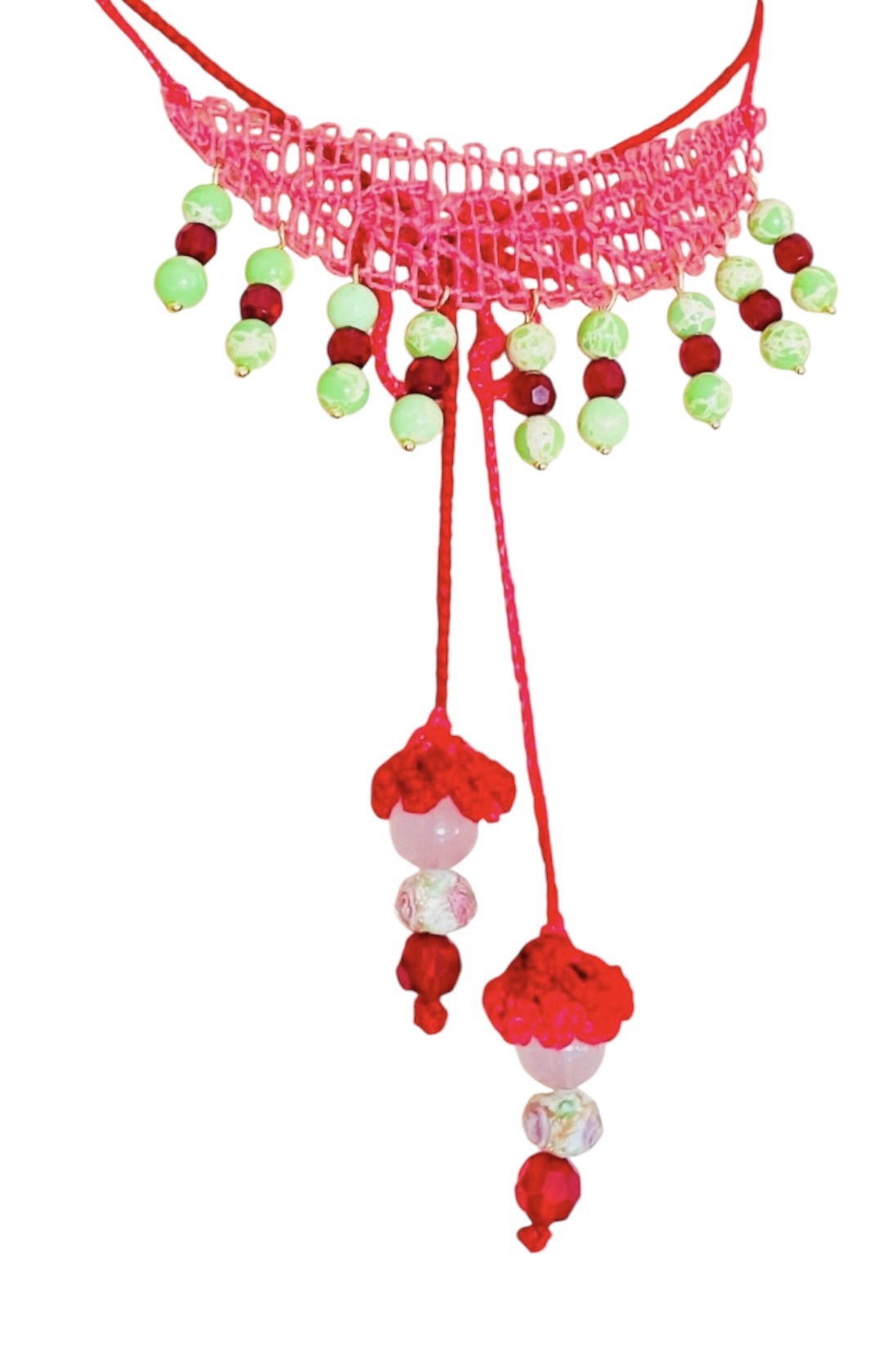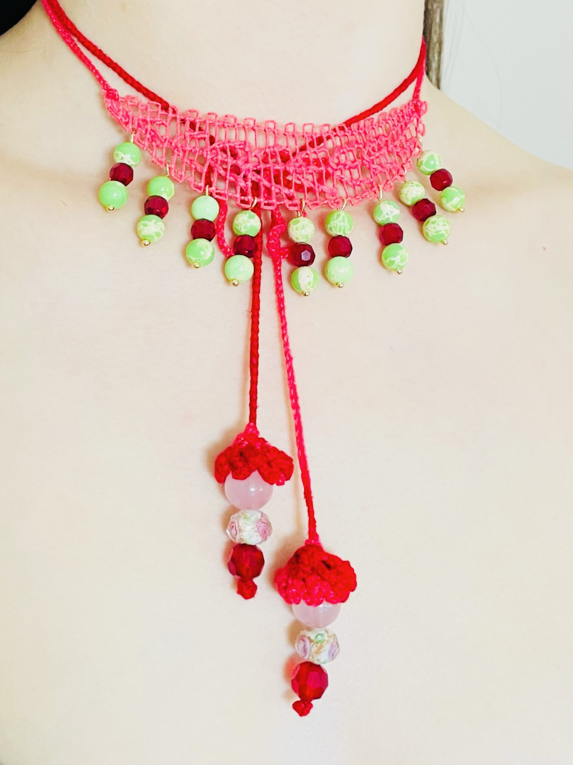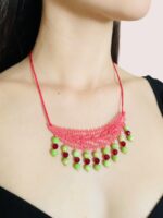 Anet collar en técnica de Ñandutí, unido a cuentas de cristal