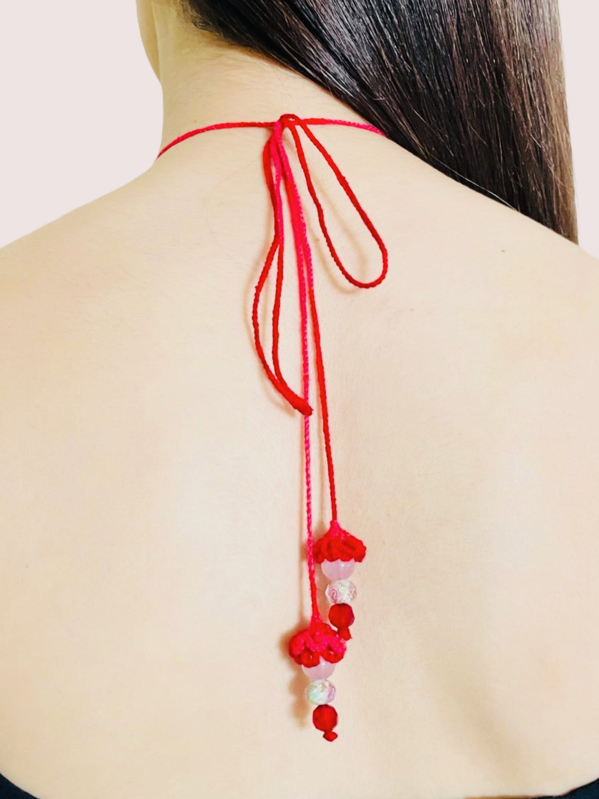 Materiales: hilo de algodón, acero inoxidable bañado en oro de 18 quilates, cuentas de cristal