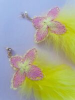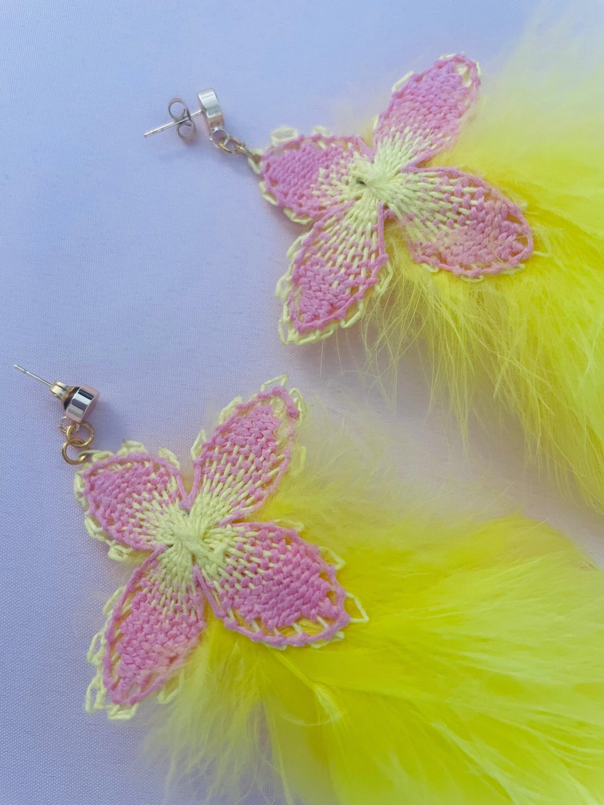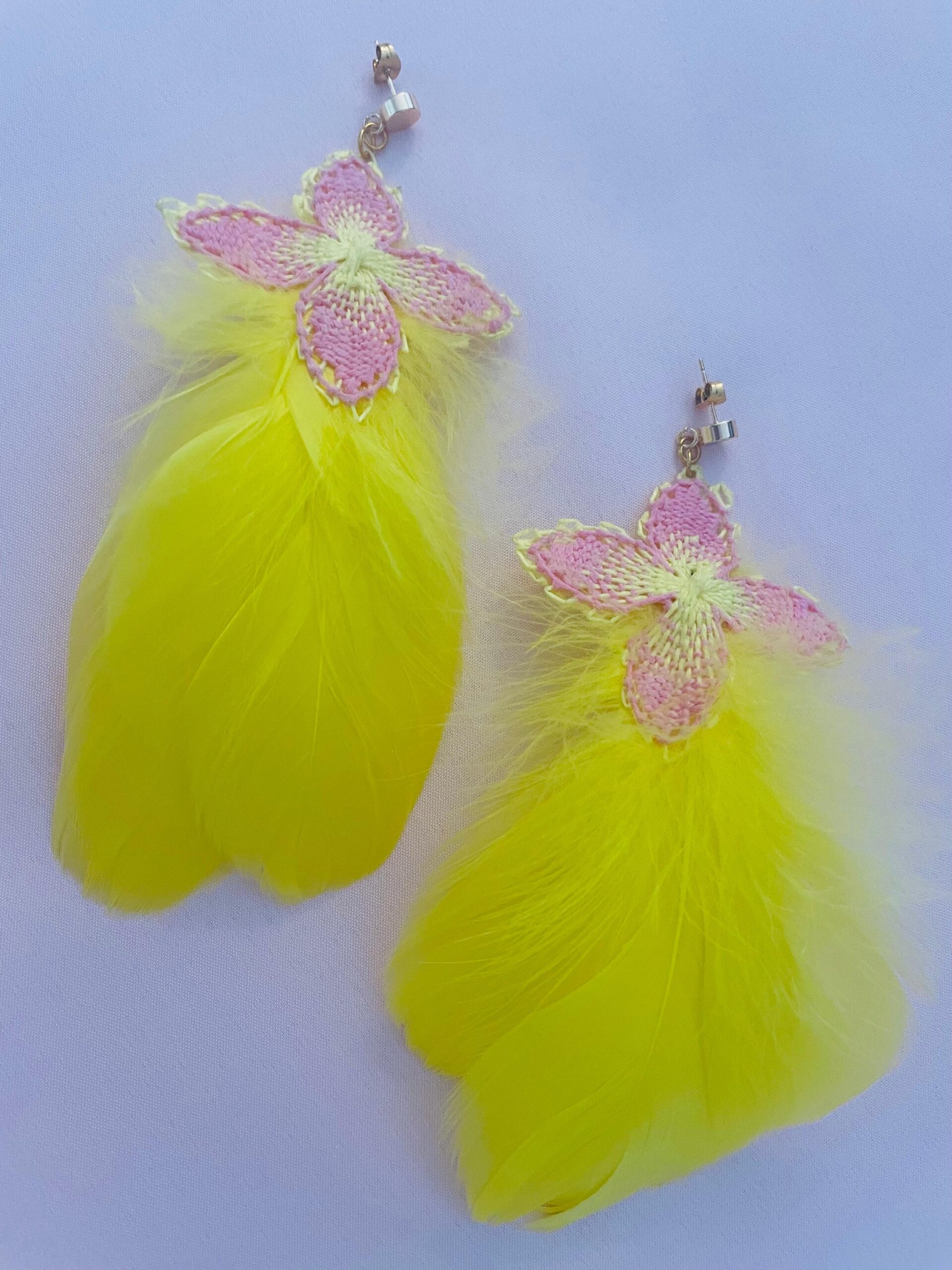 Material: Plumas, hilo de algodón,pendientes de tachuela de latón, redondos/ planos dorados.