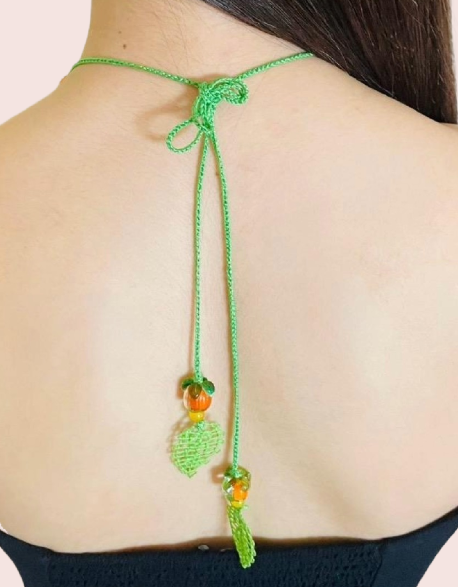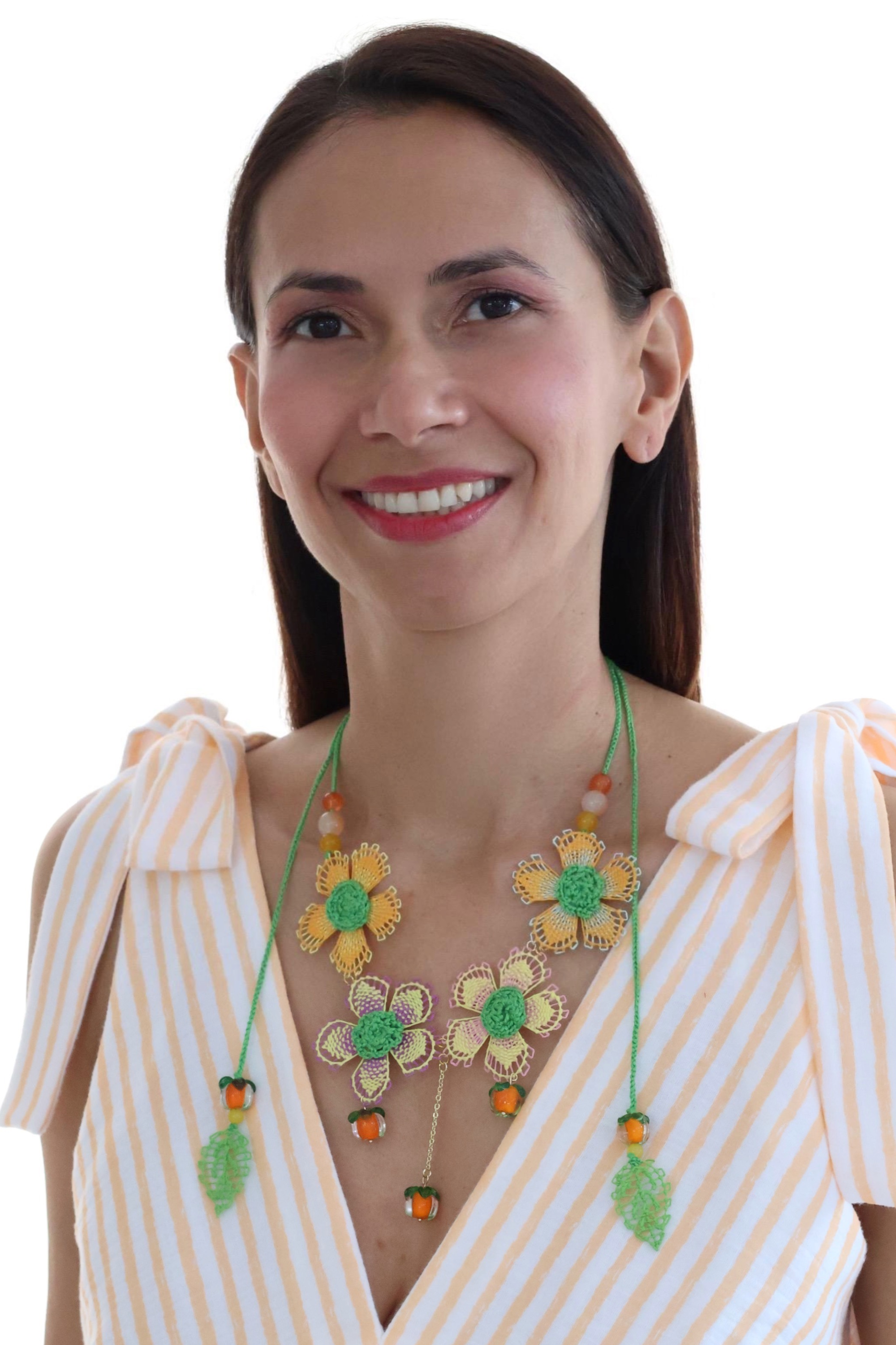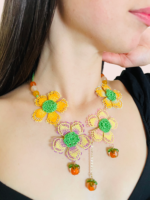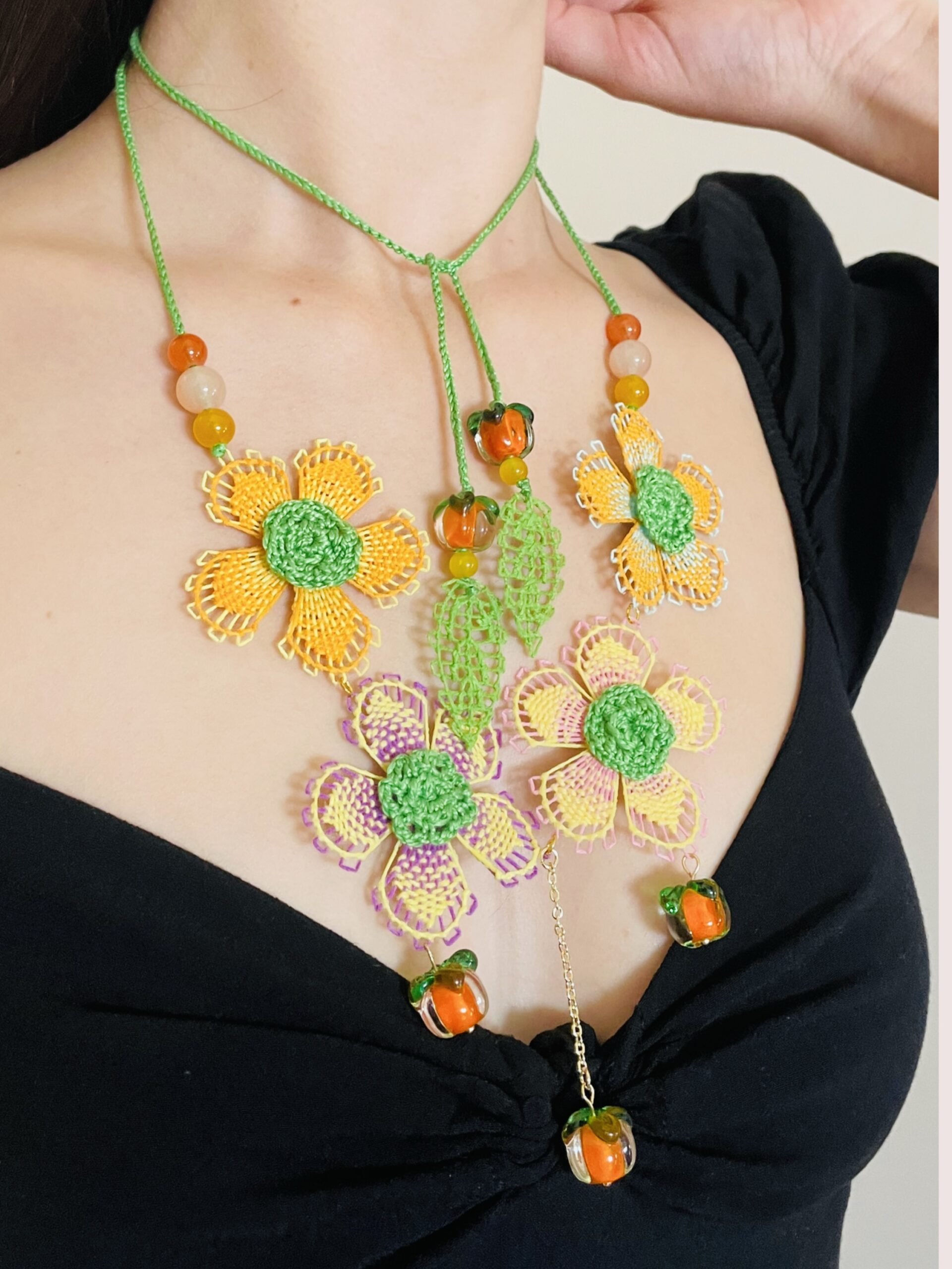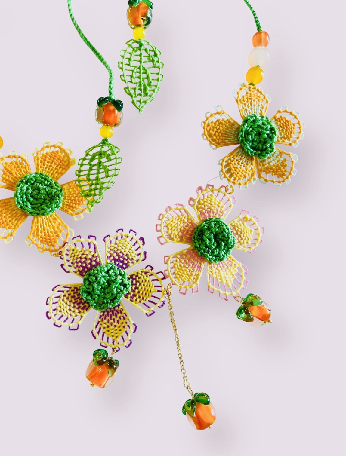 Collar en técnica de ñandutí inspirado en coloridas flores con detalles de delicados cristales en forma de frutos de caquis que cuelgan de cadenas de acero inoxidable bañados en oro de 18k, lleva una cadena ajustable de crochet con bolitas de cristal, y con un fino acabado de hojas de ñandutí y pequeños frutos de caquis de cristal. Pieza única.