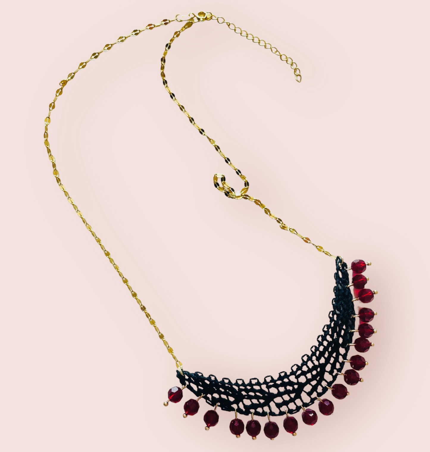 Materiales: hilo de algodón, cristales, cadena de plata de ley bañado en oro de 18 kilates