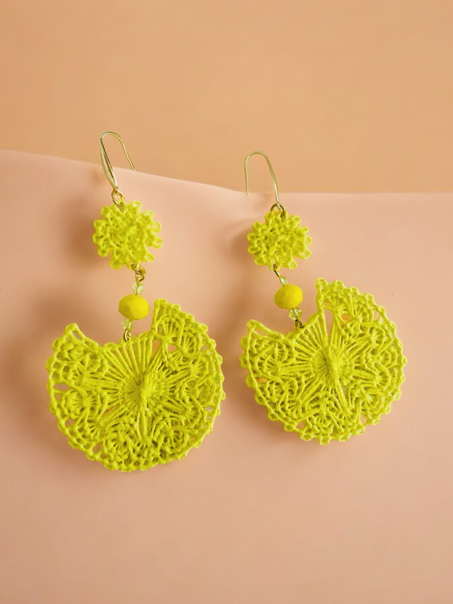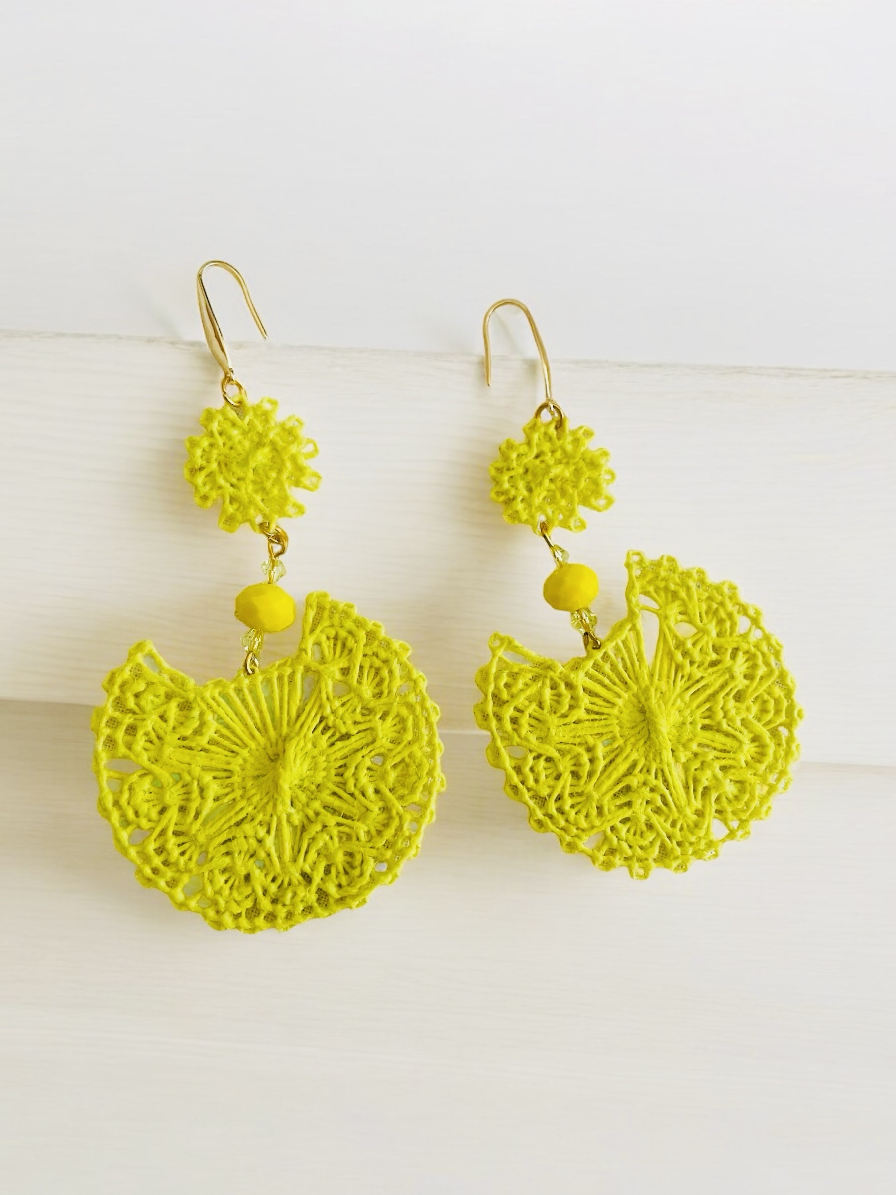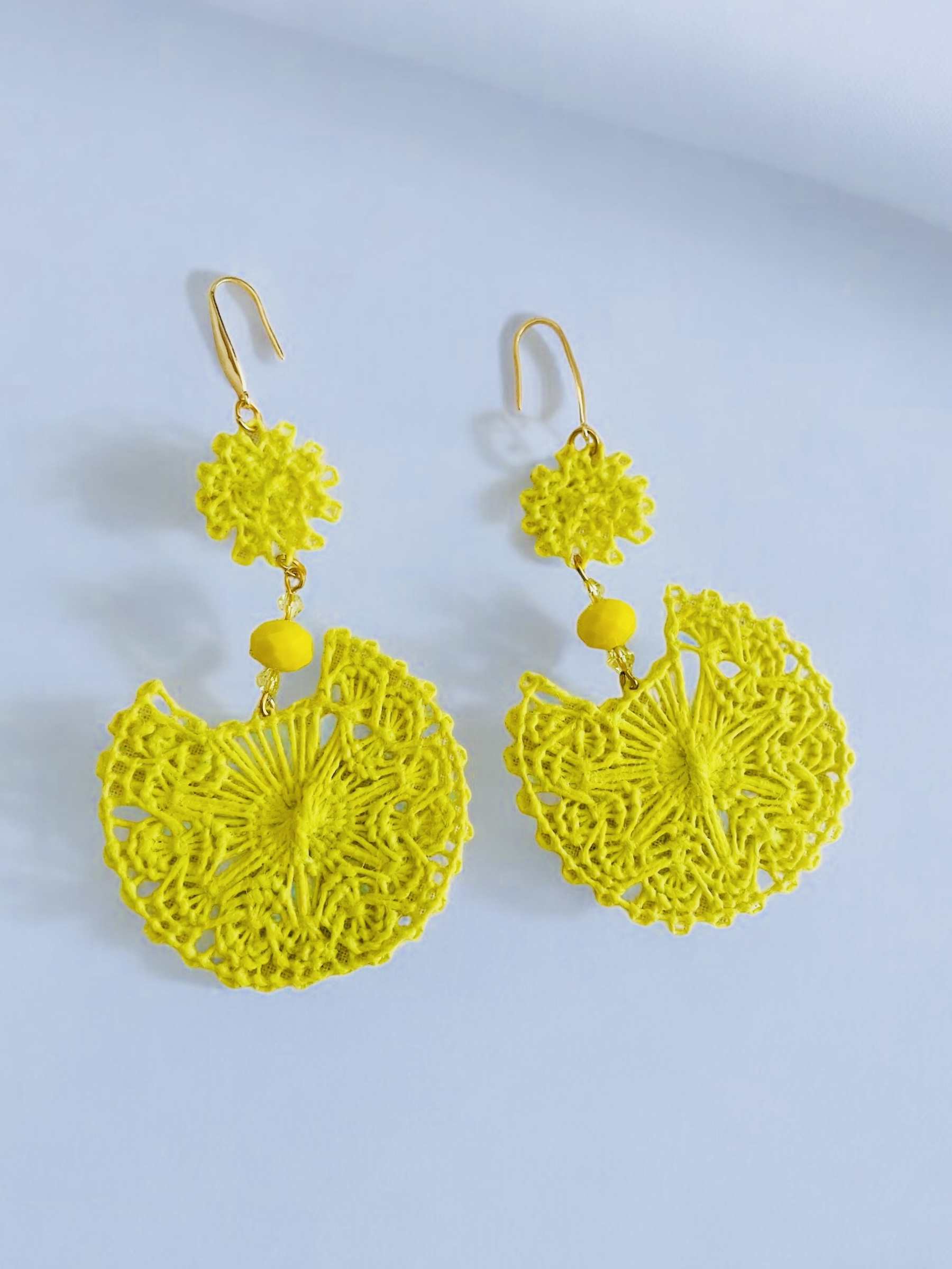 Pendientes hechos a mano con técnica de ñandutí, cierre de gancho de acero inoxidable bañado en oro de 18 quilates. Pieza única.