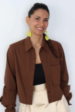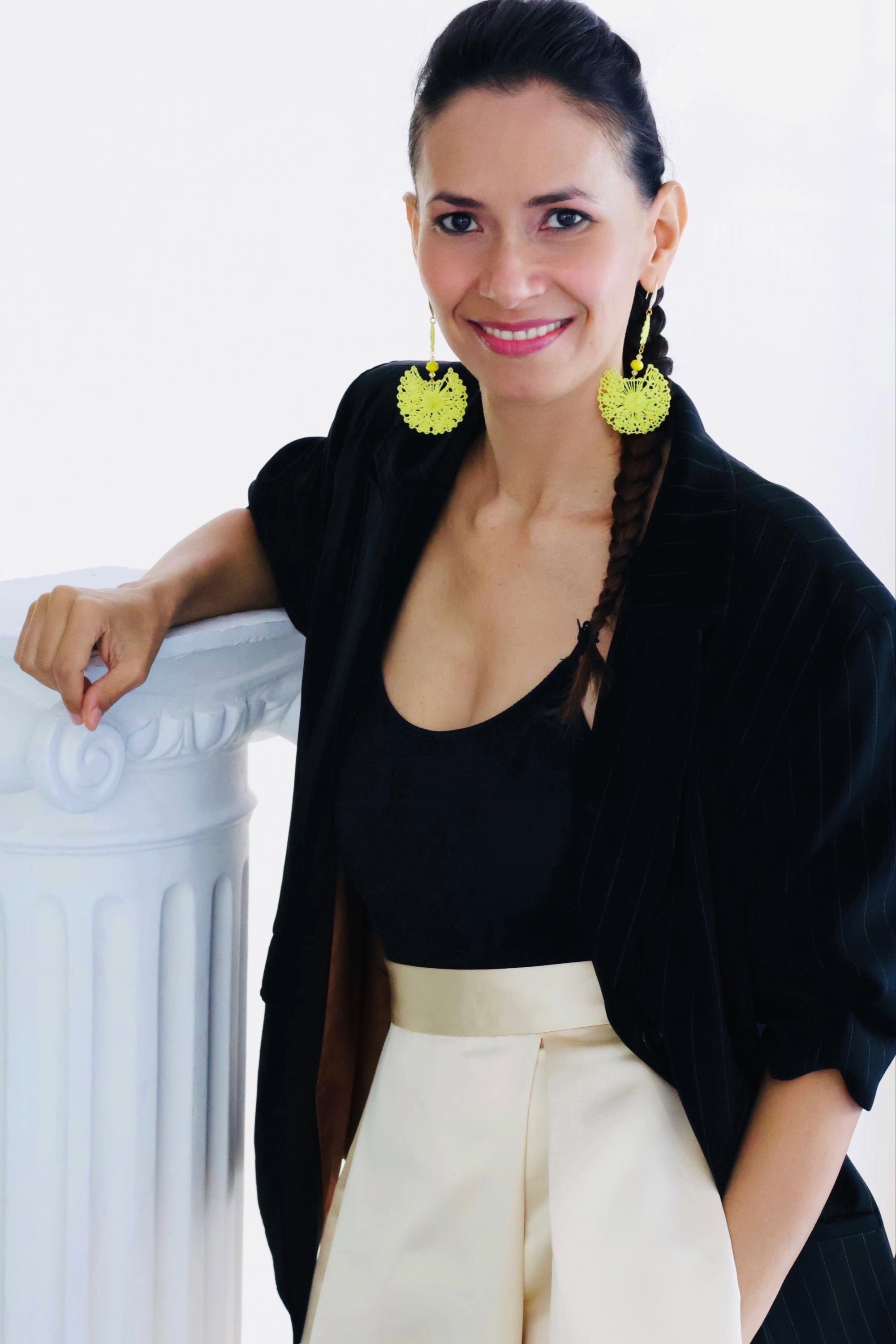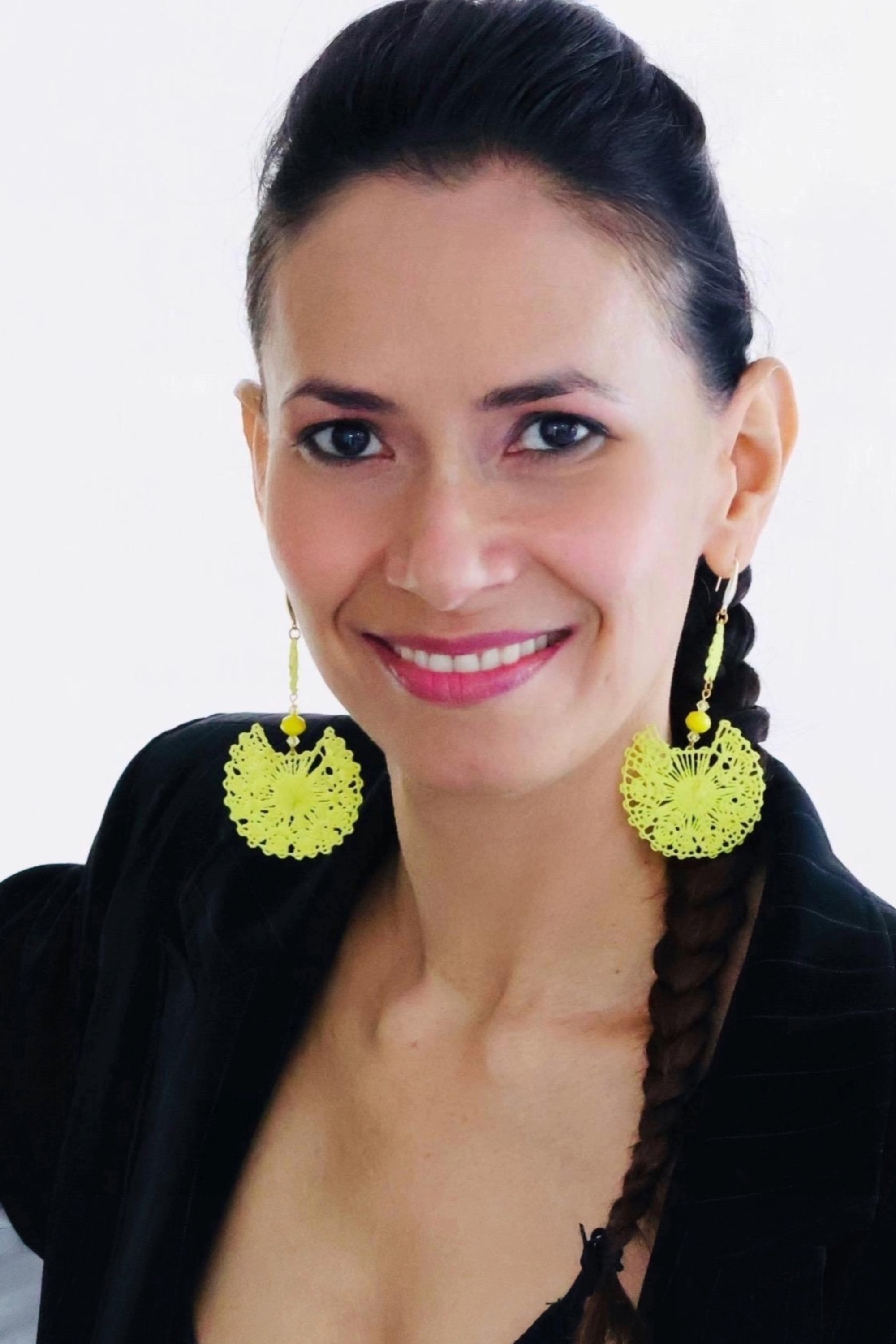 Lucía pendientes en técnica de Ñandutí, inspirados en flor de coco.