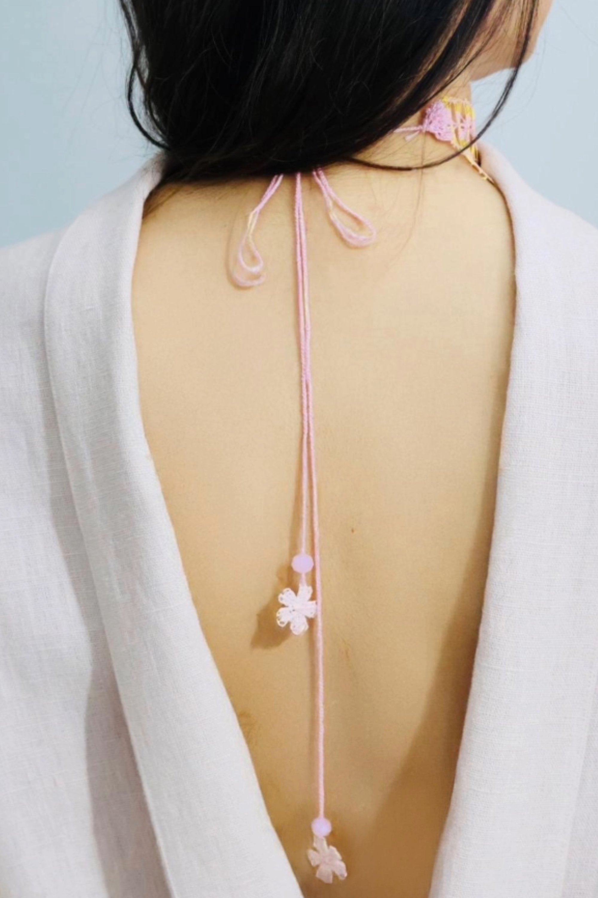 Gargantilla Randa, técnicas de Ñandutí, ajustable, con apliques de flores de ñandutí.