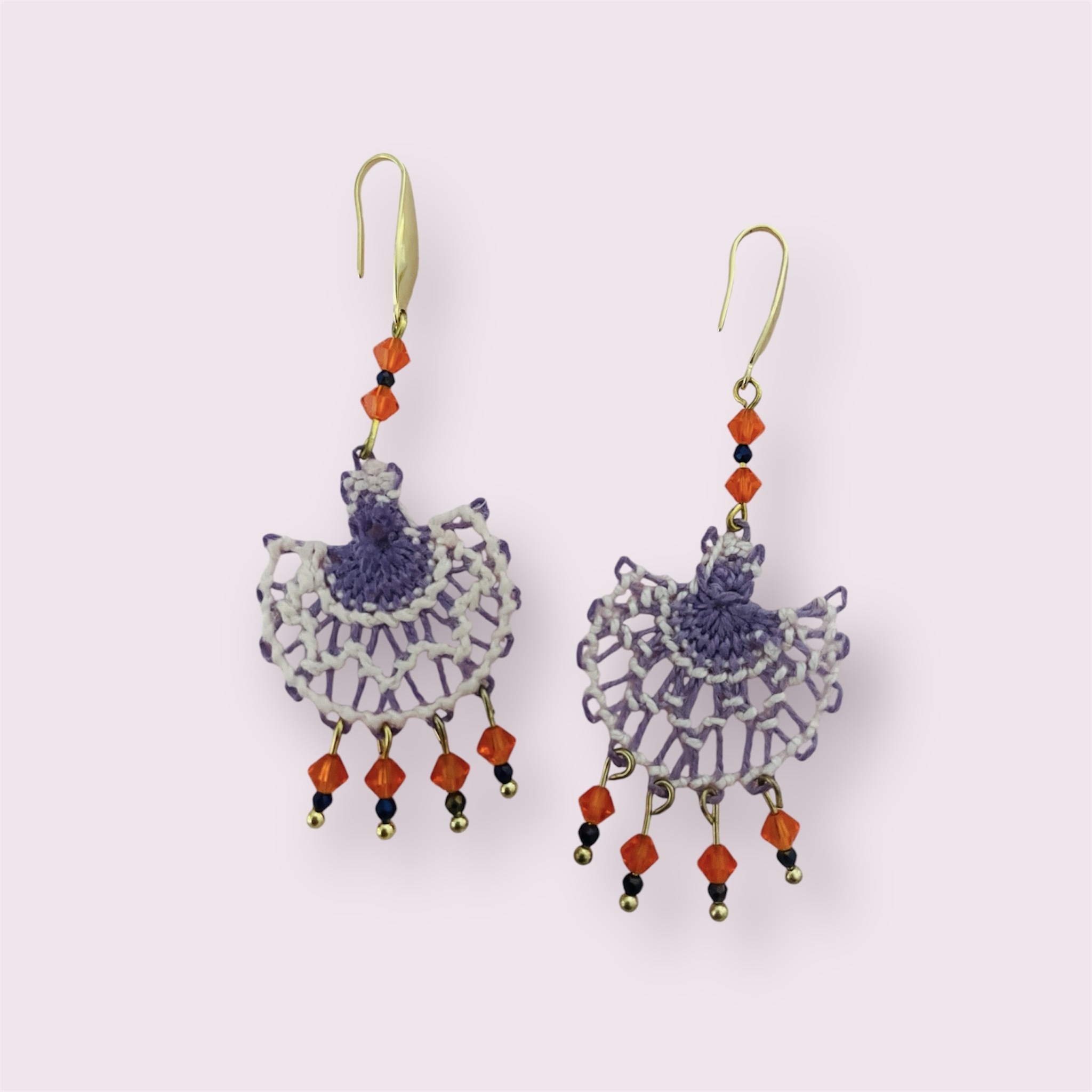Descripción Pendientes hechos a mano con técnica de ñandutí, cierre de gancho de acero inoxidable bañado en oro de 18 quilates. Pieza única.