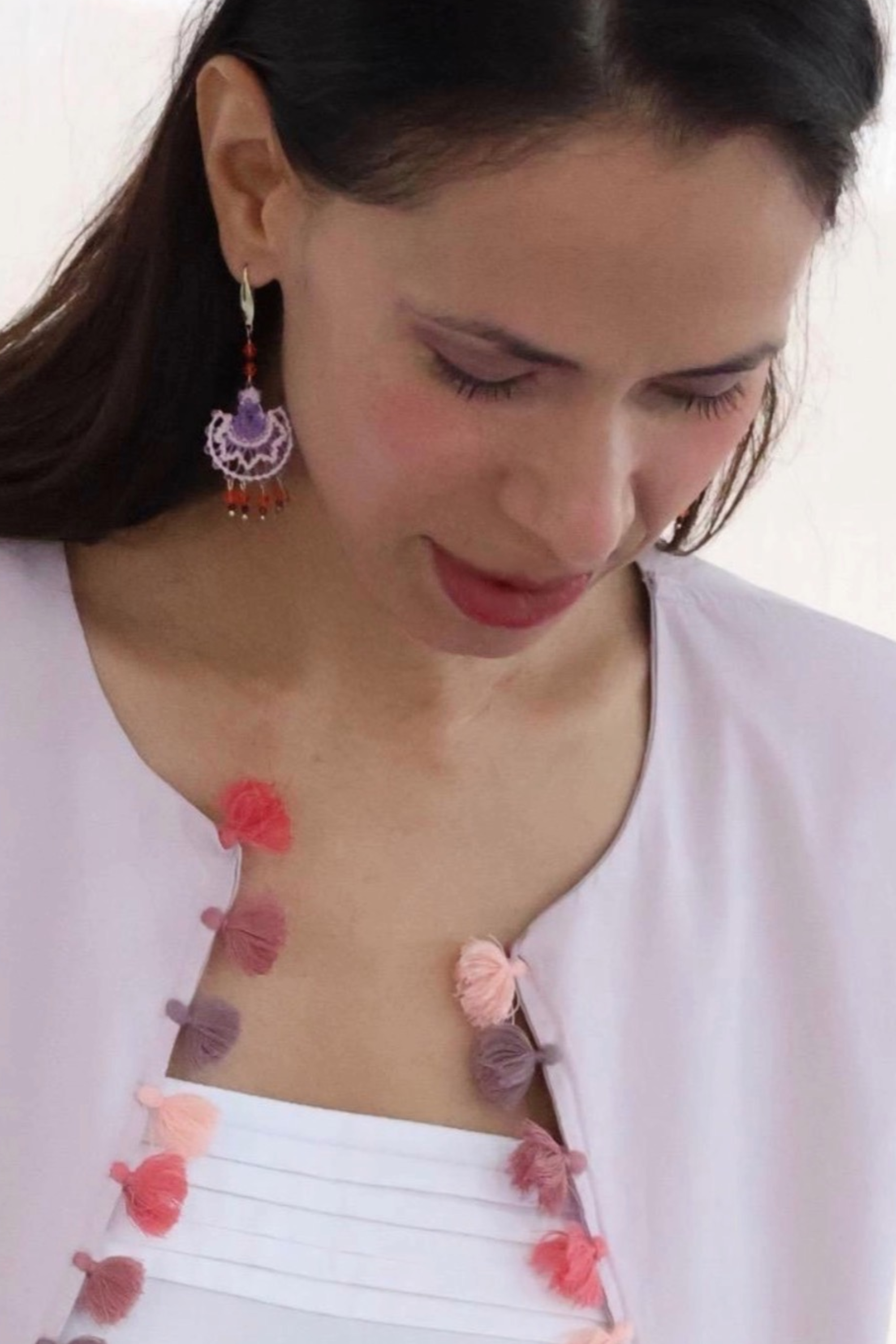 Daniela pendientes en técnica de Ñandutí, con cuentas de nácar.