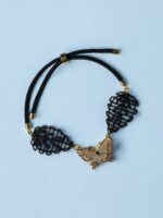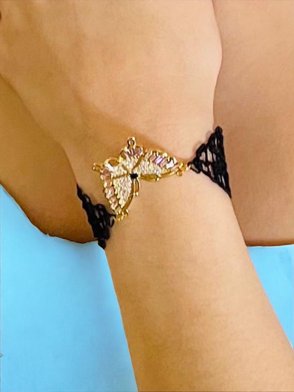 Material: hilo de algodón, pulsera de nailon trenzado, ajustable con nudo de acero inoxidable, mariposa de cobre con incrustaciones de circonio