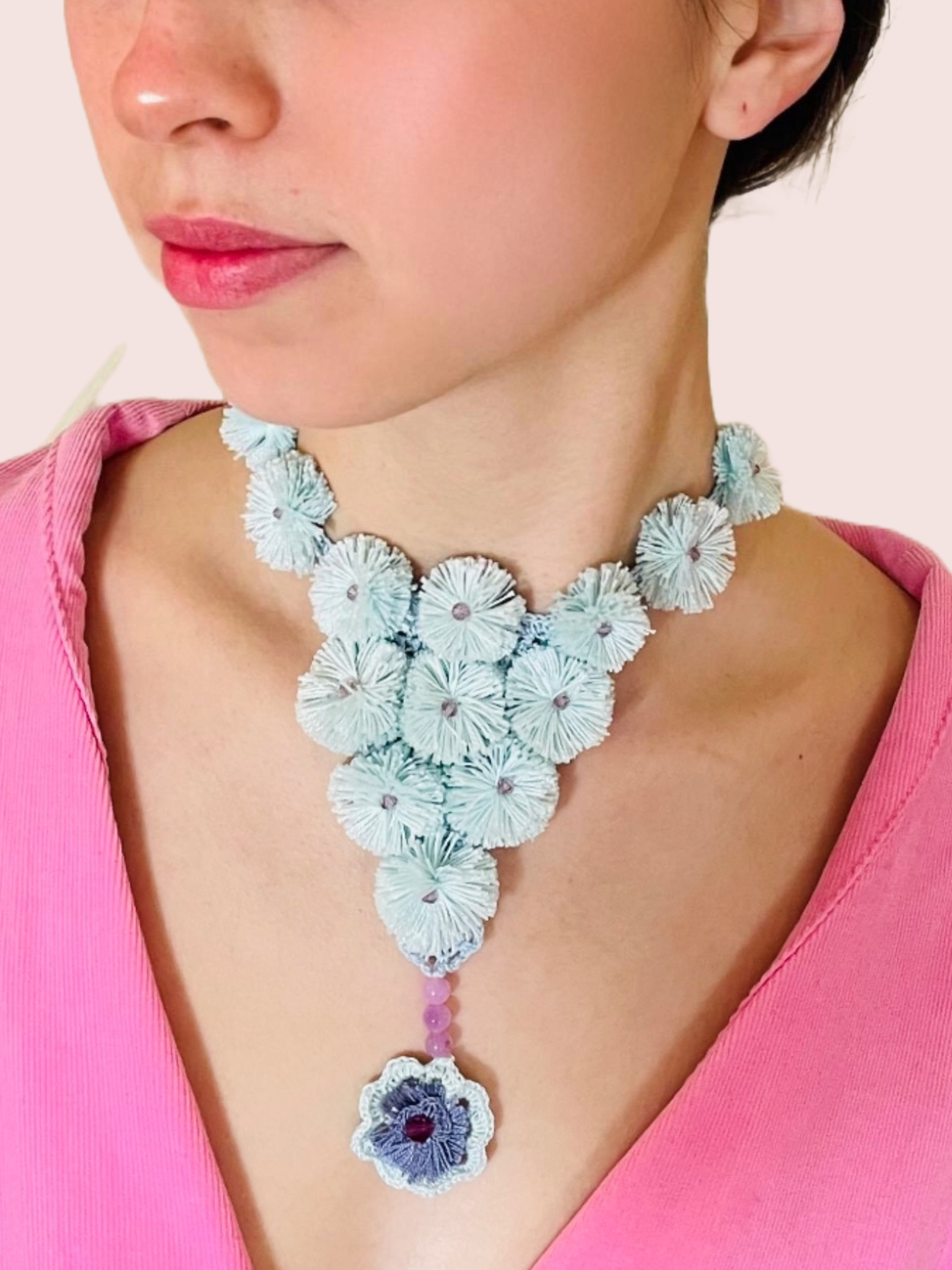 Gargantilla inspirada en flores de diente de león, técnica de crochet y borlas, con incrustaciones de piedras de Swarovski. Pieza única.