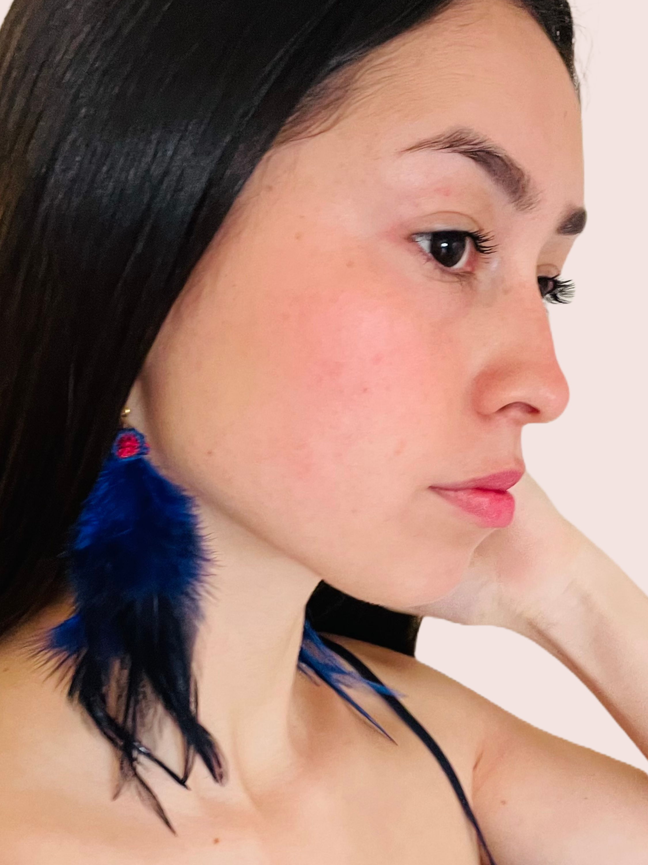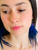 Plumas colores azul/ azul marino, detalle ñandutí, gancho de acero inoxidable.