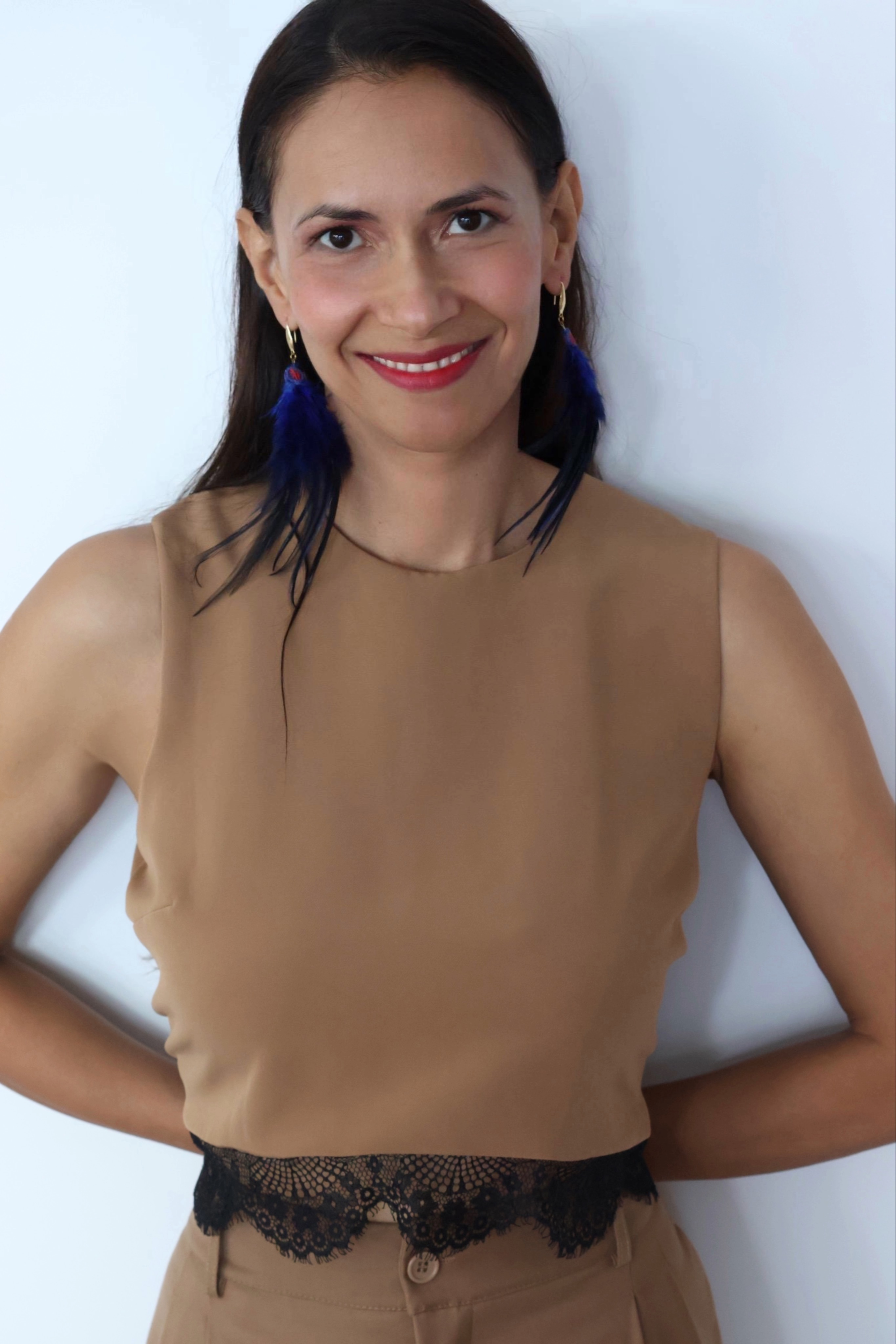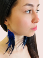 Elena pendientes en técnica de Ñandutí unidos a plumas.