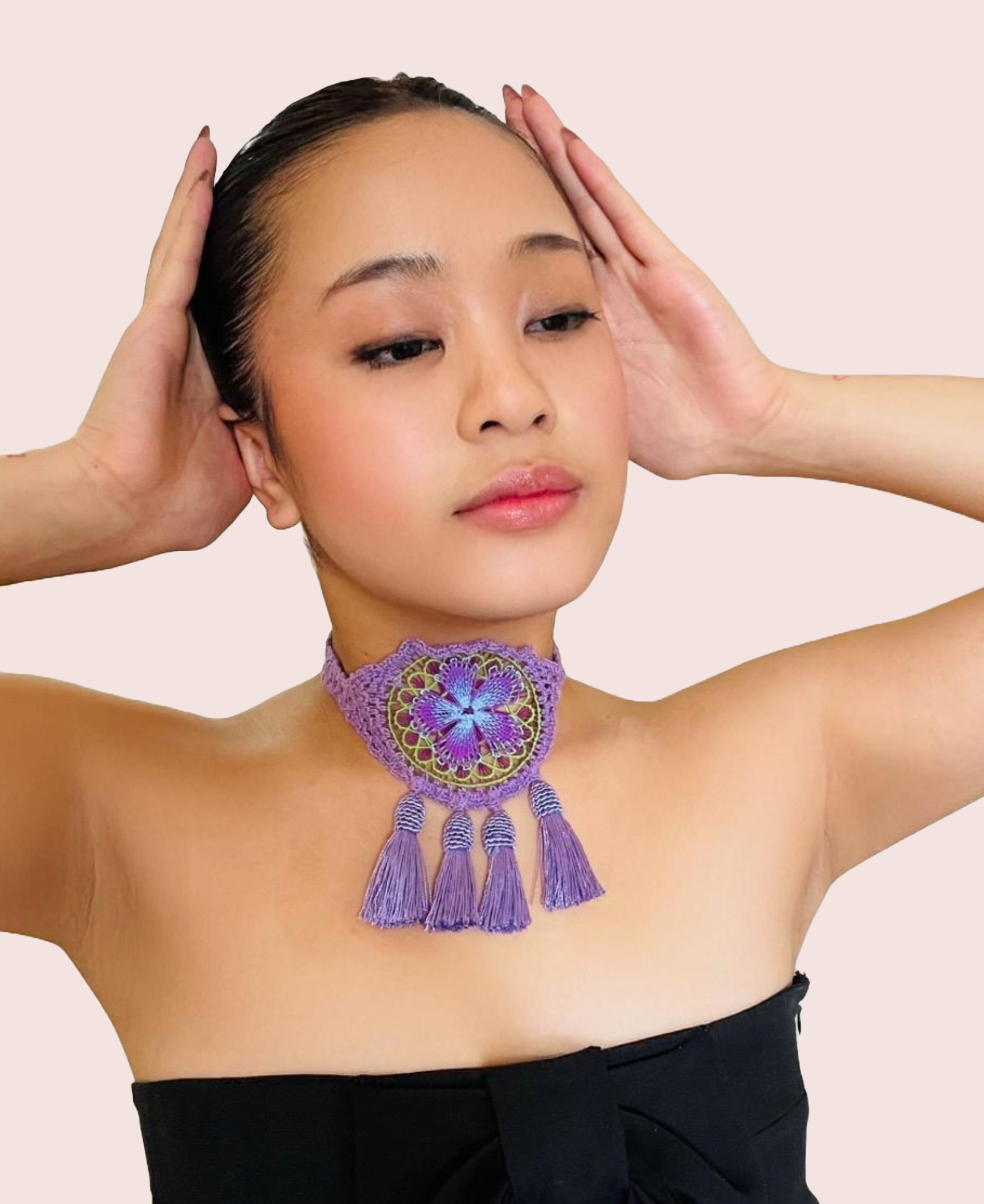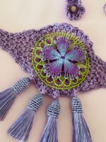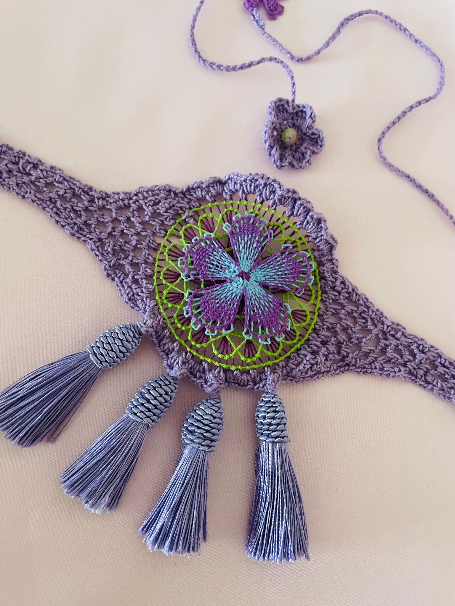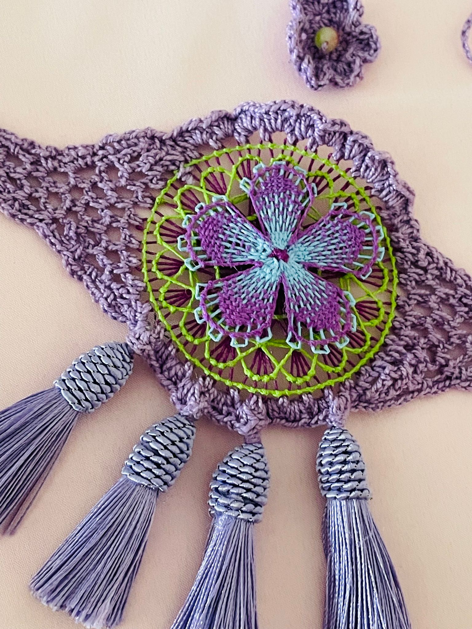 Gargantilla con técnicas de Ñandutí/Crochet colores morado, verde y celeste, borlas púrpuras. Pieza única.