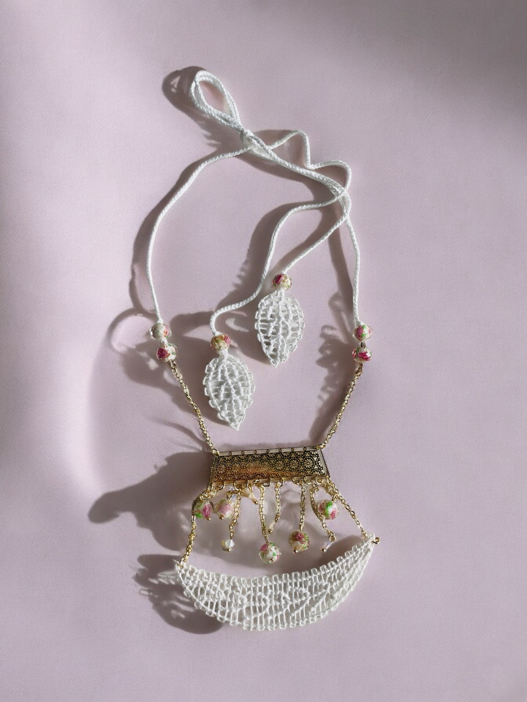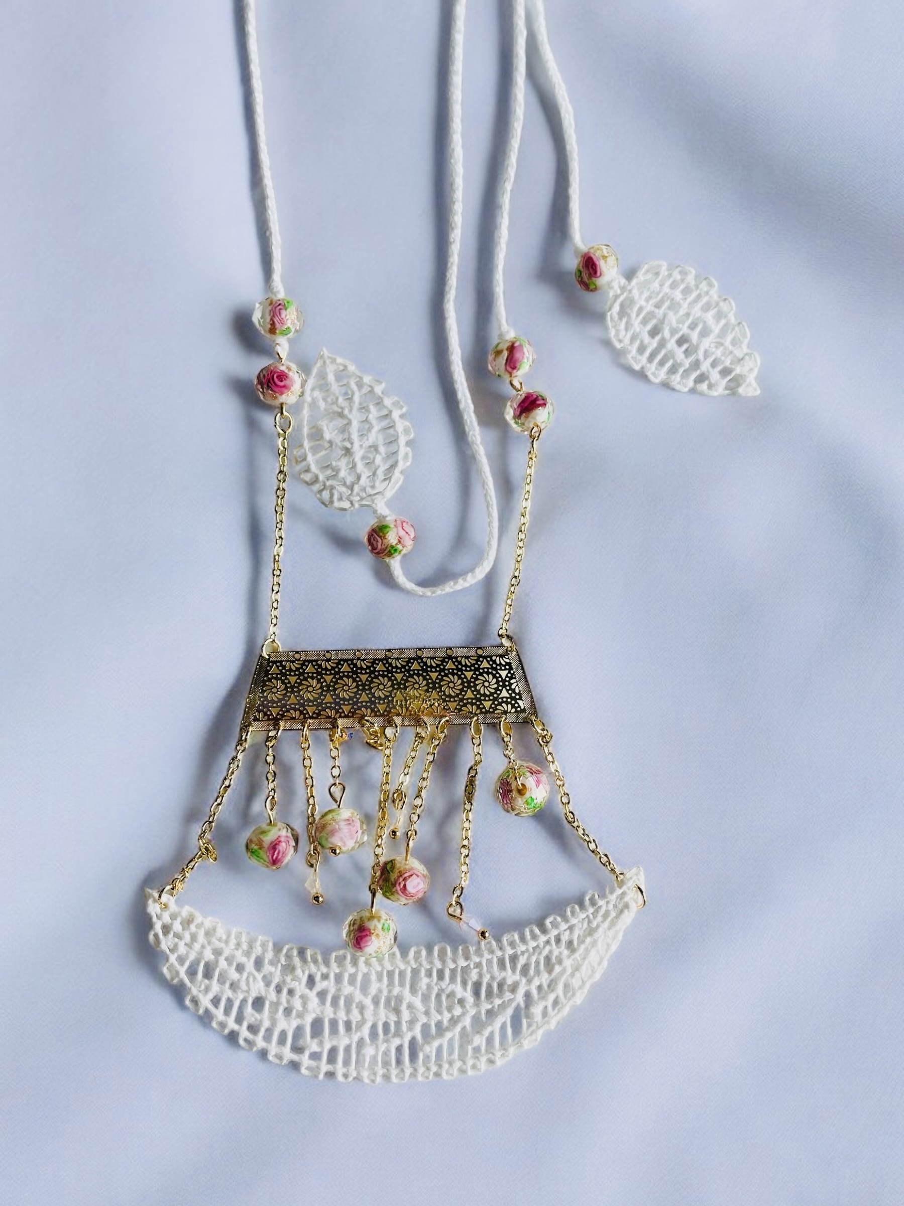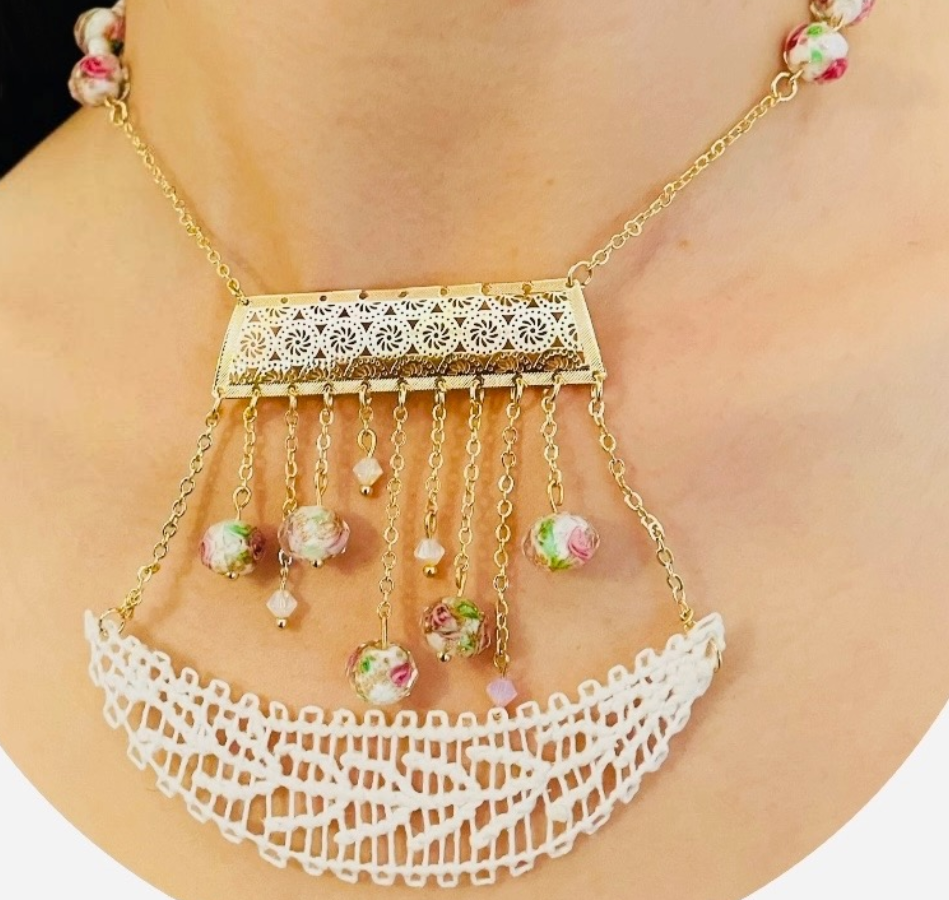 Rocio collar en técnica de Ñandutí con detalles de crochet unidos a cristales