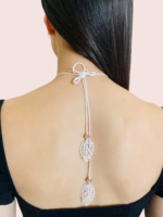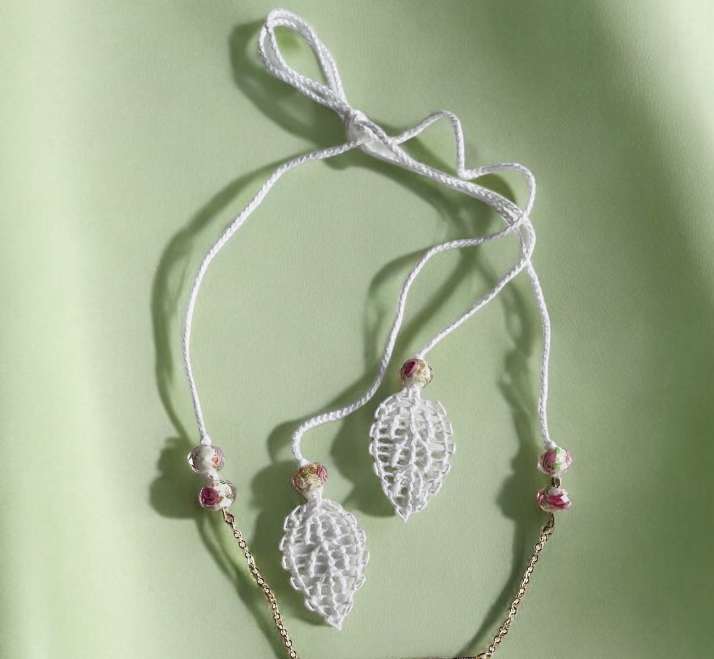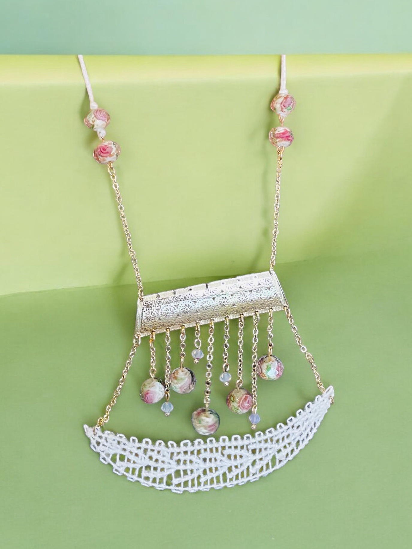 Materiales: hilo de algodón, cadena de acero inoxidable bañado en oro de 18 quilates, cuentas de cristal
