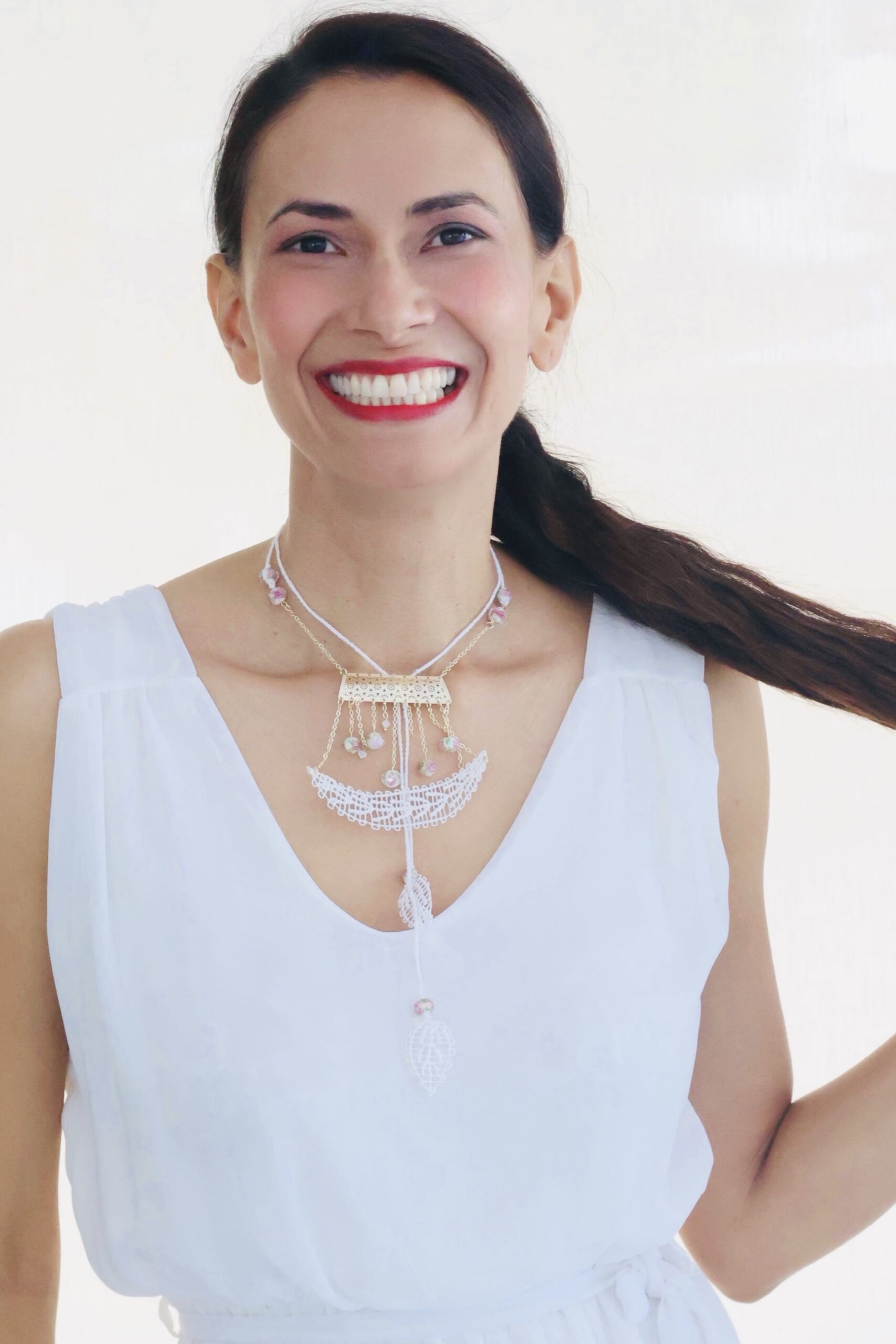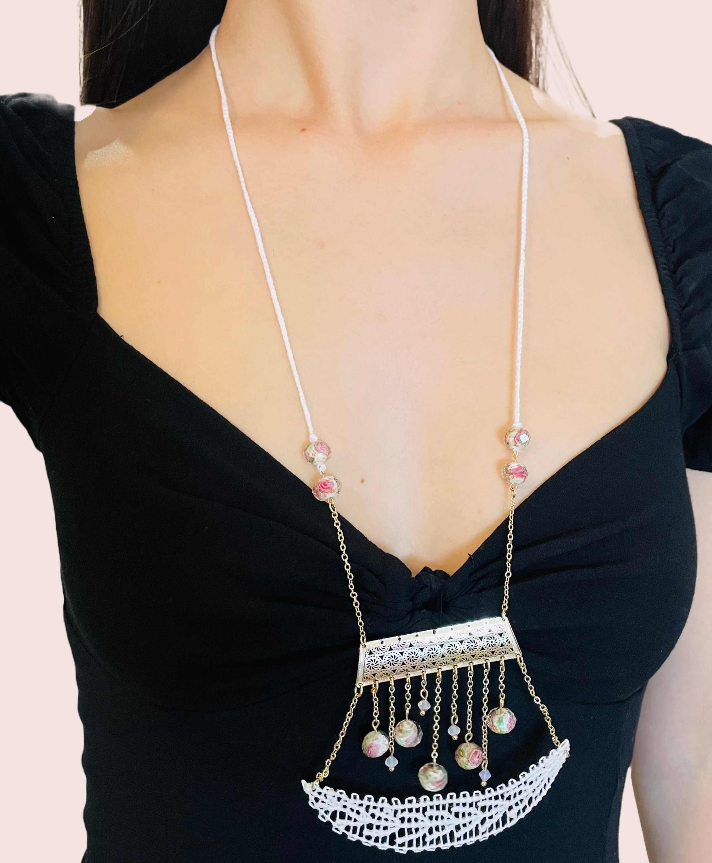 Inicio Sin categorizar Rocio collar en técnica de Ñandutí con detalles de crochet unidos a cristales