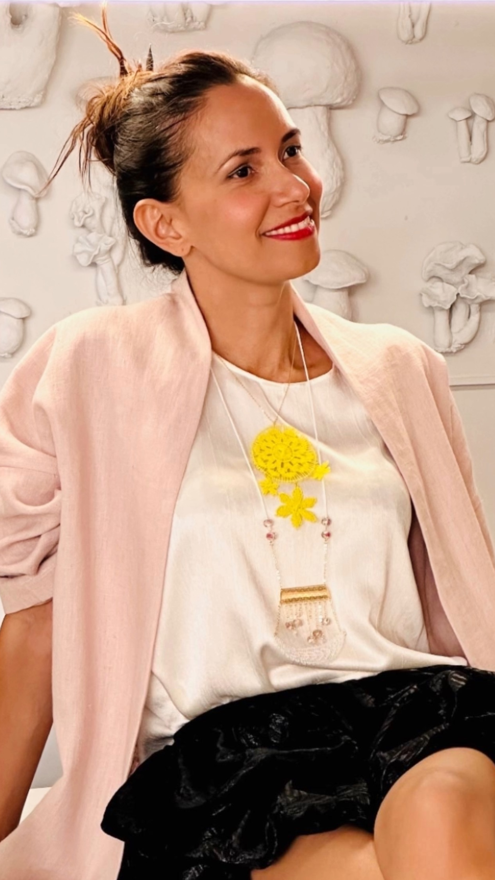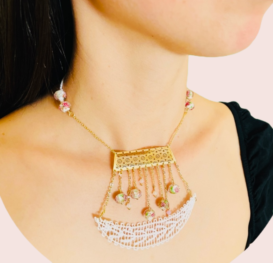 Claudia collar en técnica de ñandutí inspirado en coloridas flores con detalles