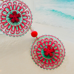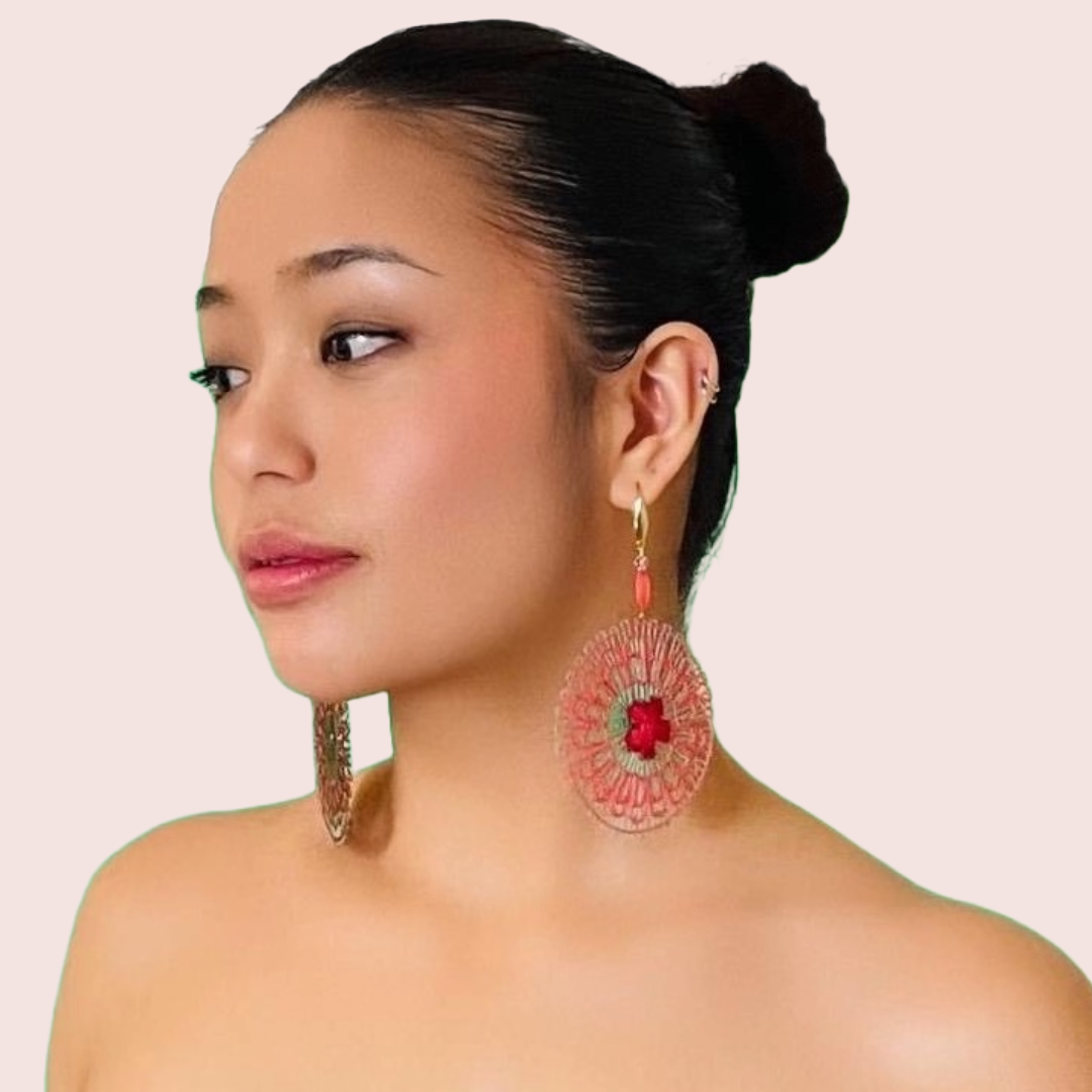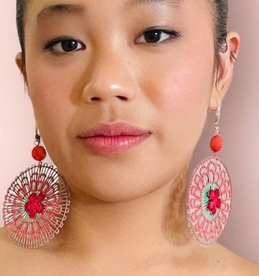 Lucía pendientes en técnica de Ñandutí, inspirados en flor de coco.