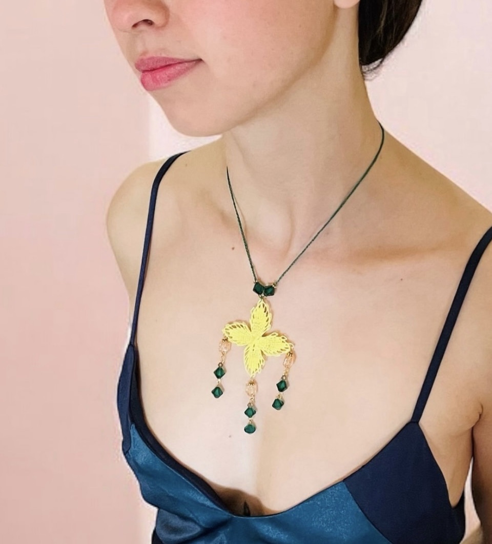 Silvia collar en técnica de Ñandutí inspirado en flor de jazmín con cristales