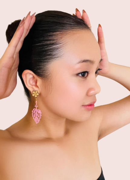 Eva pendientes en técnica de Ñandutí, inspirados en hojas rosas.