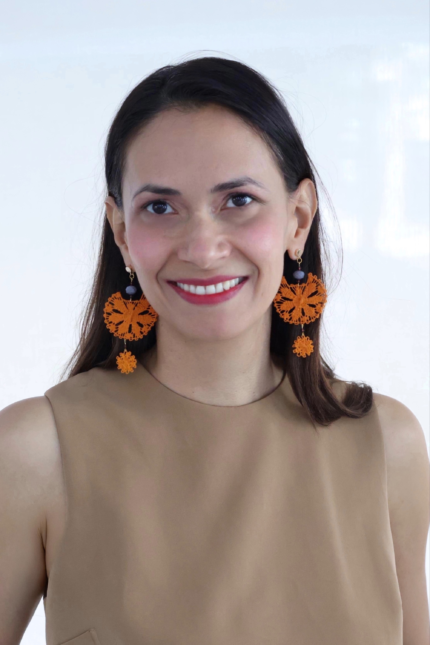Lucía pendientes en técnica de Ñandutí, inspirados en flor de coco.