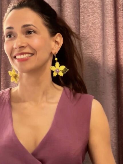 Clara pendientes en técnica de Ñandutí, inspirados en flores de jazmín.