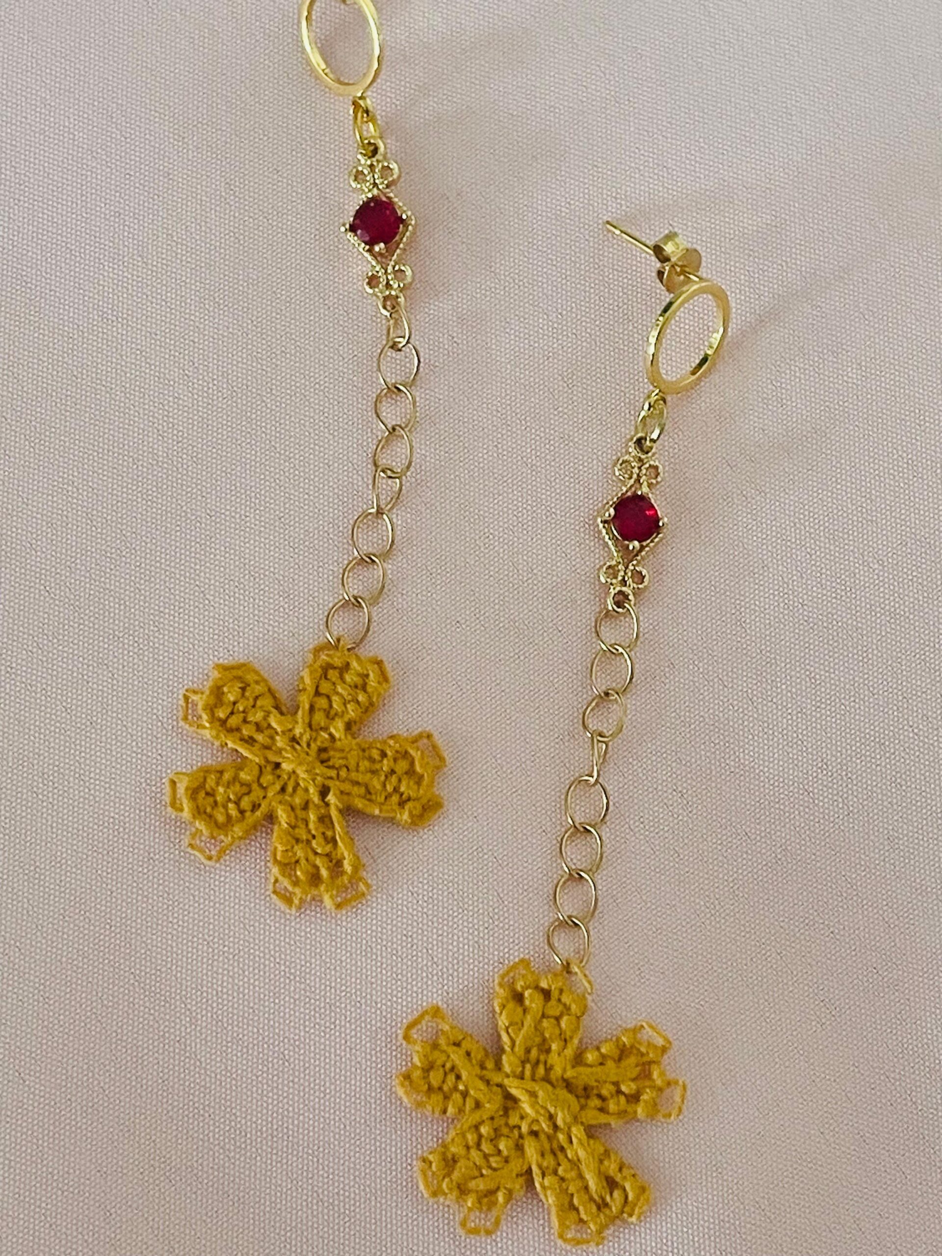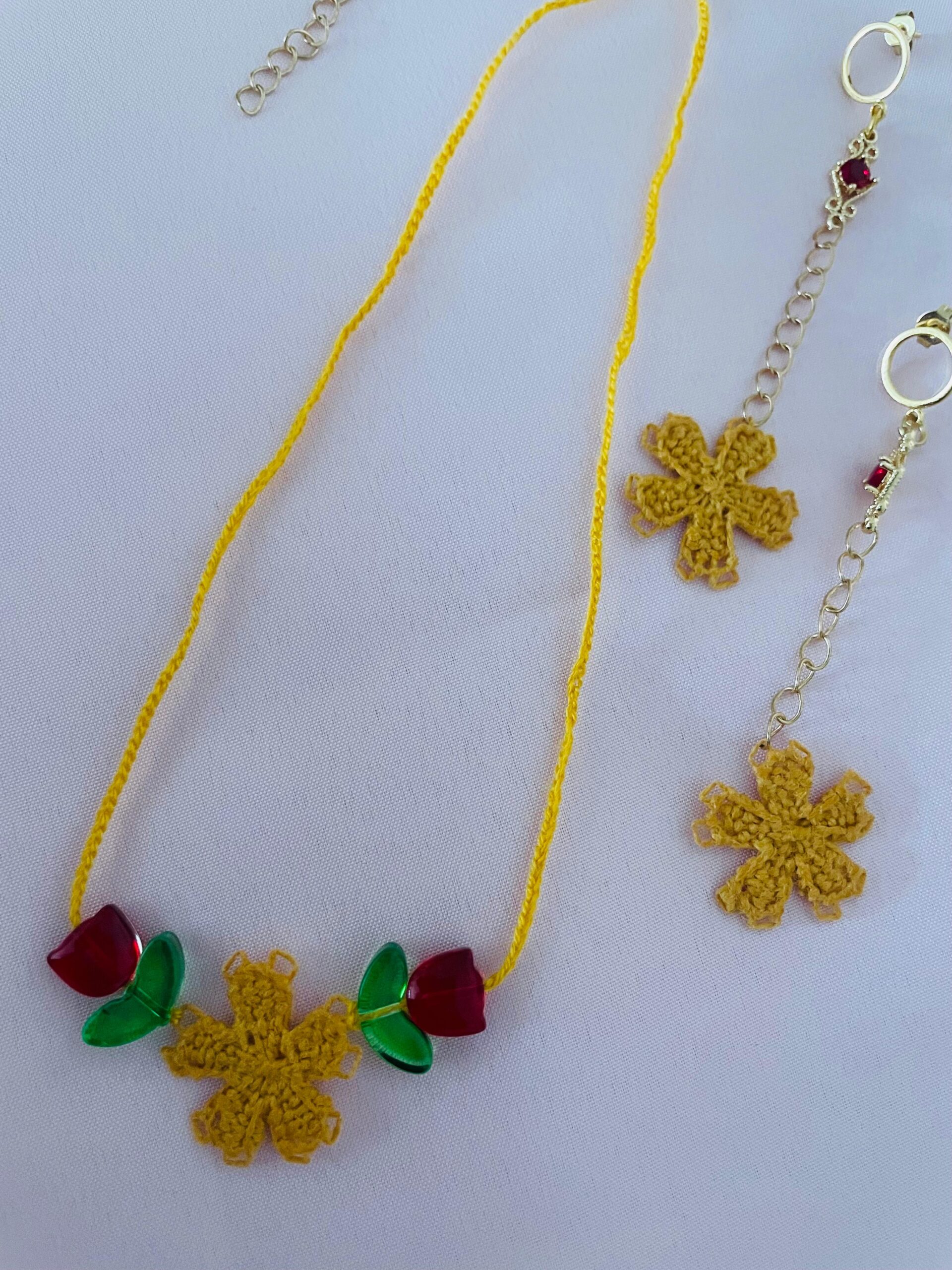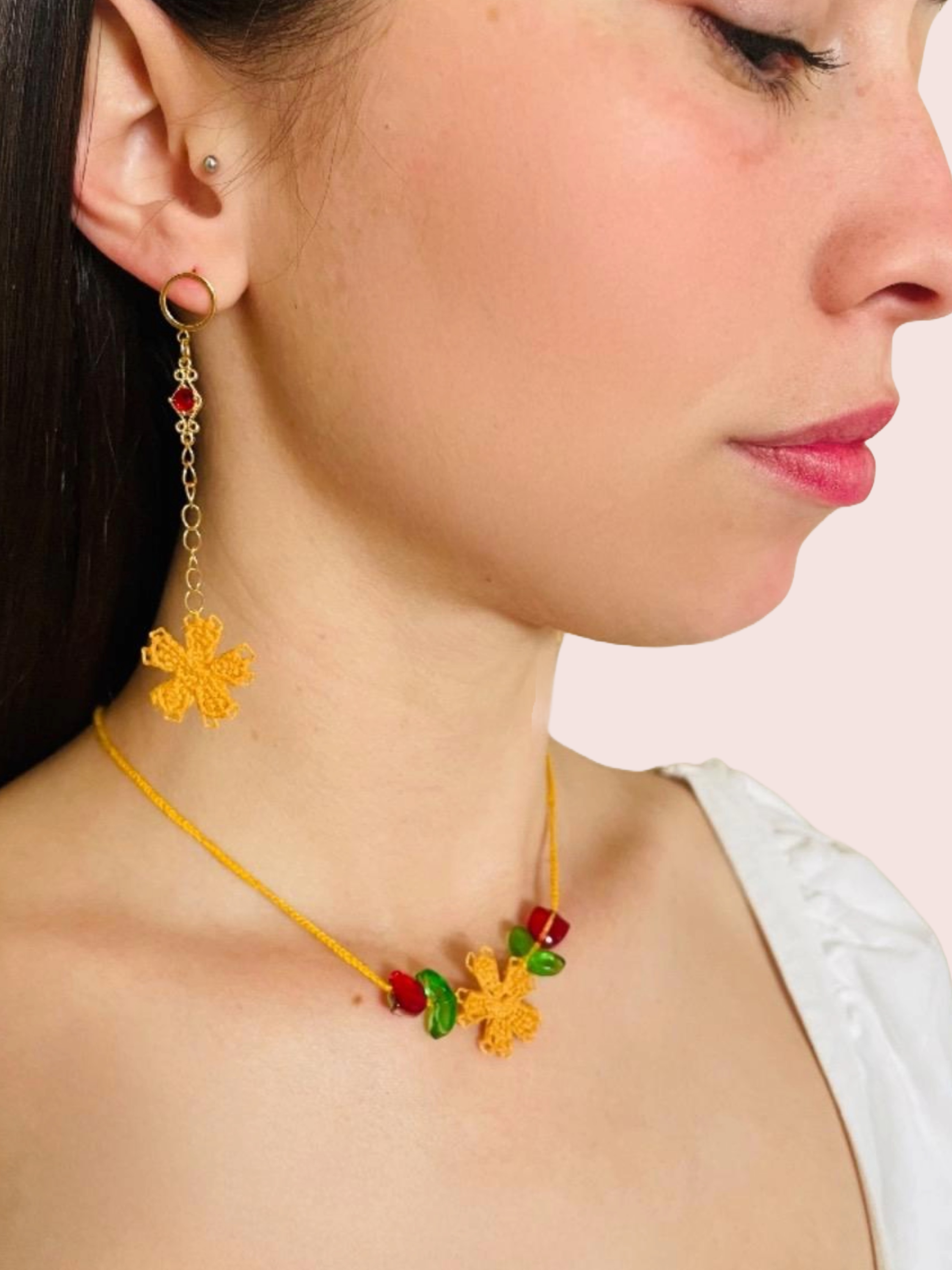 Conjunto de gargantilla/ pendientes colgantes con técnica de Ñandutí inspirado en flores de campo. Pieza única.