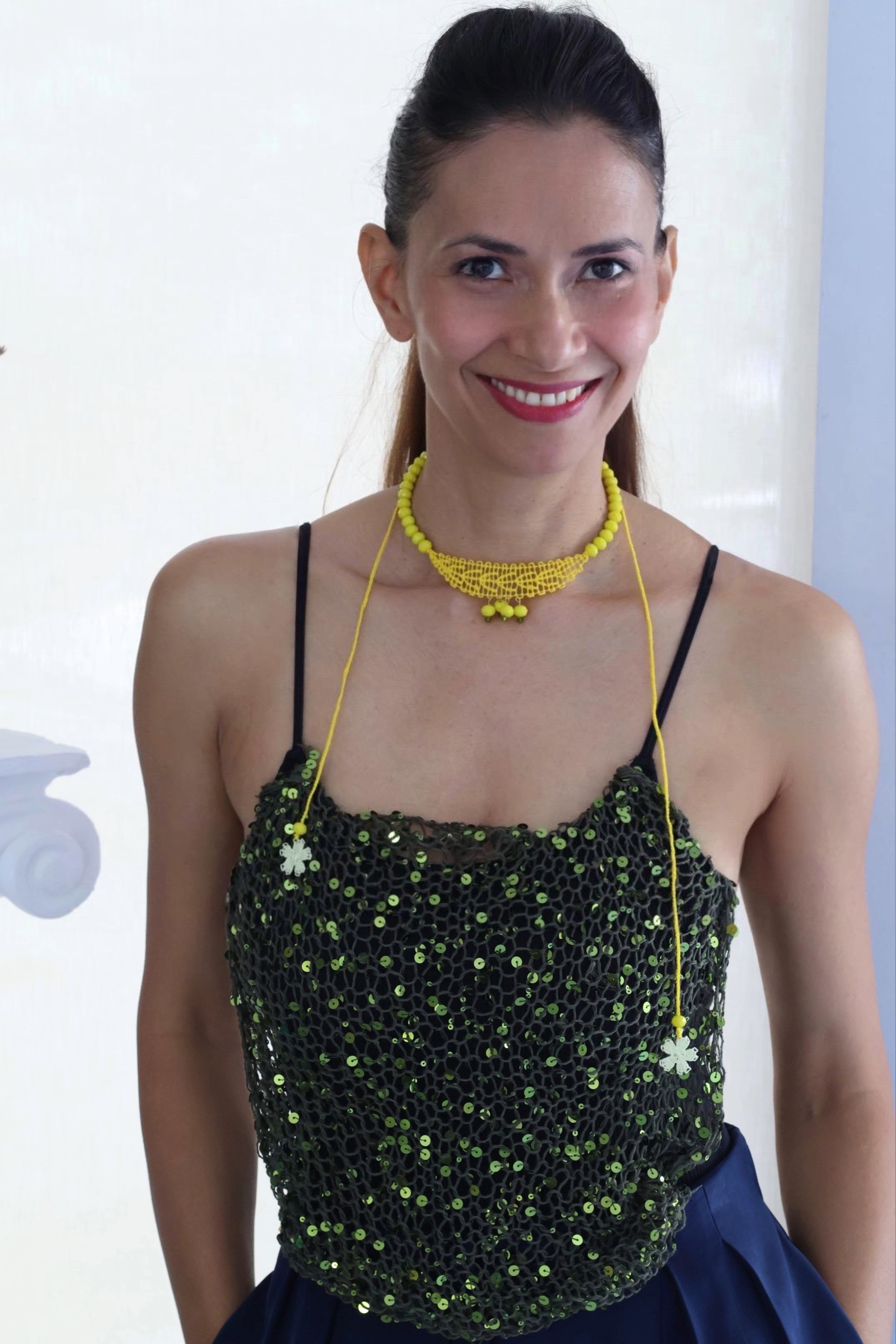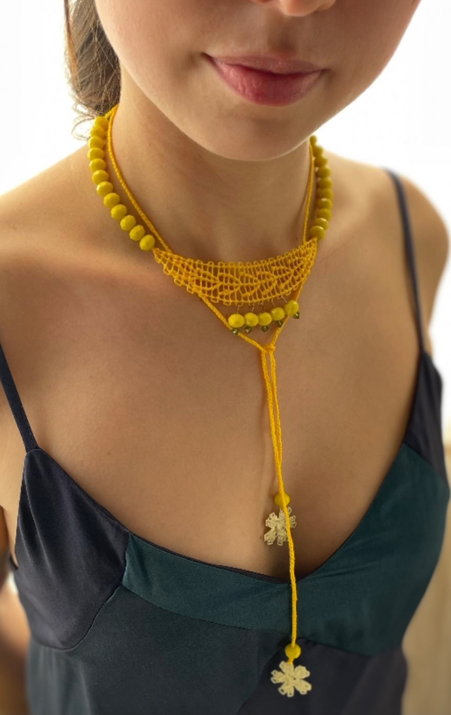 Camila collar en técnica de Ñandutí con detalles de crochet unidos a cristales